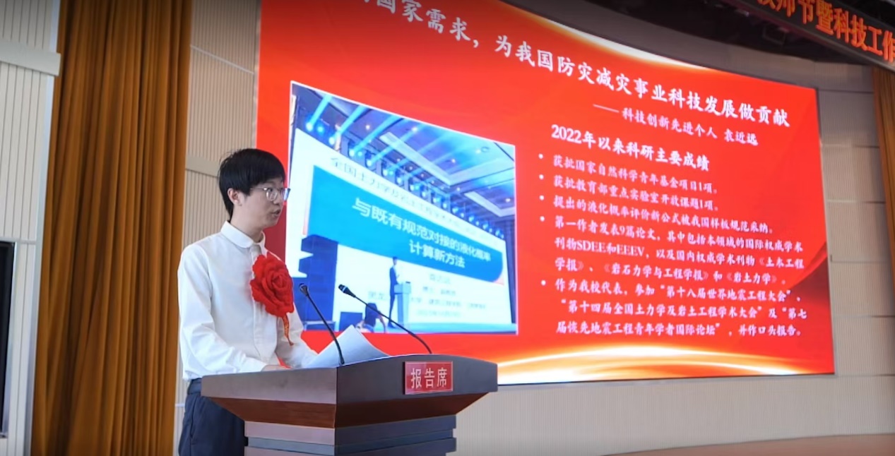 作为我校先进科技工作者代表,袁近远表示:“科研的最终目的是服务国家和社会,本人将继续聚焦国家重大需求,力争产出更多原创性、引领性成果,并把这种求实创新的精神传递给学生。”展望未来,他将以入选省青年科技人才托举工程为新起点,矢志在岩土工程防灾减灾领域深耕细作,为筑牢国家工程安全防线、为学校高质量发展贡献青春力量。