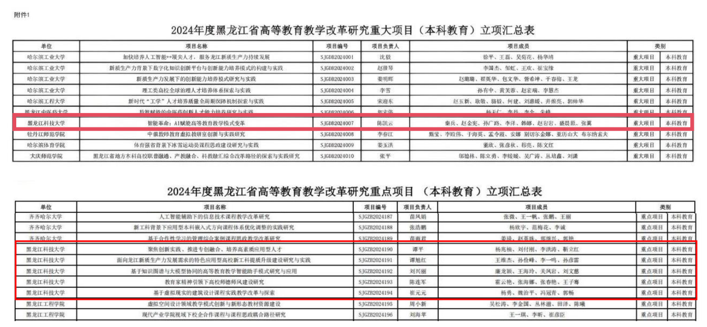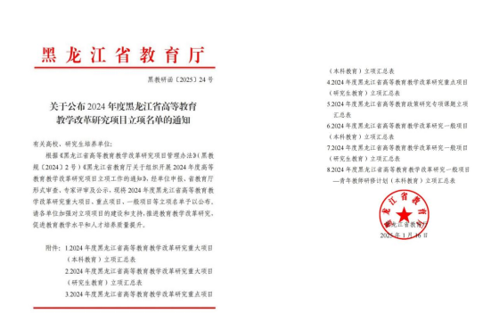近日,黑龙江省教育厅发布了《关于公布2024年度黑龙江省高等教育教学改革研究项目立项项目的通知》黑教研函〔2025〕24号,我校推荐的教学改革研究项目喜获佳绩,获批31项,其中,重大项目(本科教育)1项,重点项目(本科教育)5项,一般项目(本科教育)24项,一般项目-青年教师研修计划(本科教育)1项。