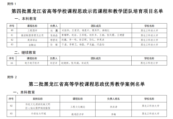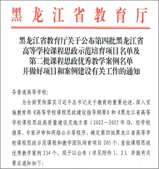 近日,黑龙江省教育厅发布了《黑龙江省教育厅关于公布第四批黑龙江省高等学校课程思政示范培育项目名单及第二批课程思政优秀教学案例名单并做好项目和案例建设有关工作的通知》,我校的五门课程、两个优秀教学案例分别获批黑龙江省高等学校课程思政示范课程和教学团队培育项目、第二批课程思政优秀教学案例,课程思政示范课程和教学团队培育项目100%获批。