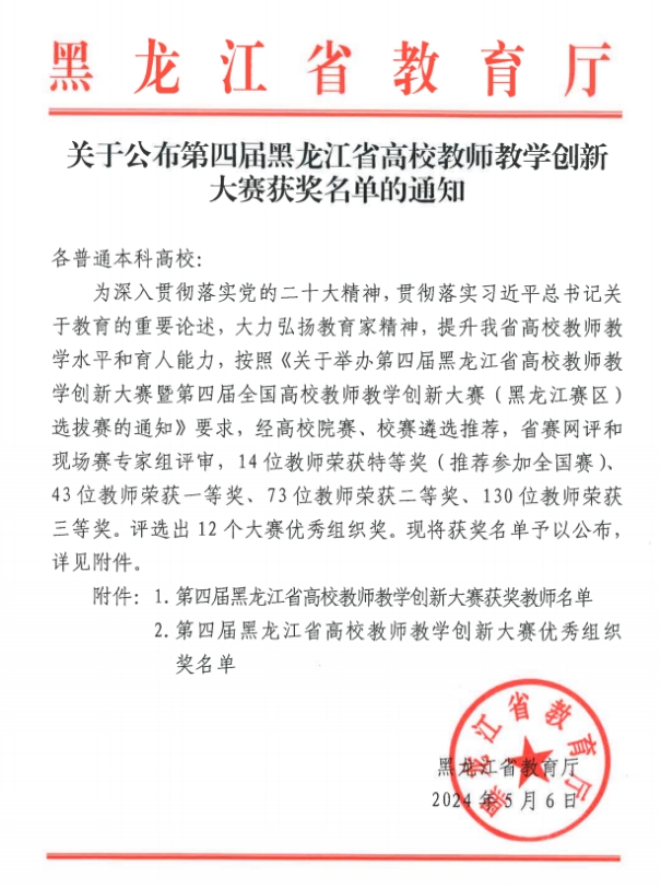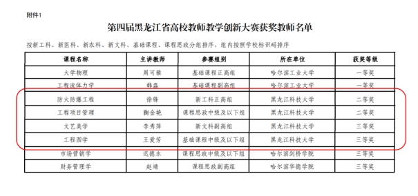 近日,由黑龙江省教育厅主办、哈尔滨工程大学承办的第四届黑龙江省高校教师教学创新大赛暨全国高校教师教学创新大赛(黑龙江赛区)选拔赛落下帷幕。我校安全工程学院徐锋团队荣获新工科正高组二等奖,机械工程学院鞠金艳团队荣获课程思政中级及以下组二等奖,人文社会科学学院李秀萍团队荣获新文科副高组三等奖,机械工程学院王爱芳团队荣获基础课程中级及以下组三等奖。