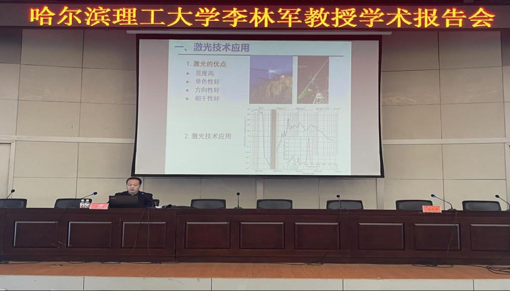 报告会上,李林军作了题为《基于频率变换固体激光技术研究》的学术报告,由浅入深地介绍了激光技术在医疗、科学研究、农业、军事等领域的应用,以及激光技术在气体浓度检测、温度测试、矿石成分检测等方面的应用,重点介绍了李林军及其团队在基于频率变换固体激光技术研究的主要工作和取得的成果。