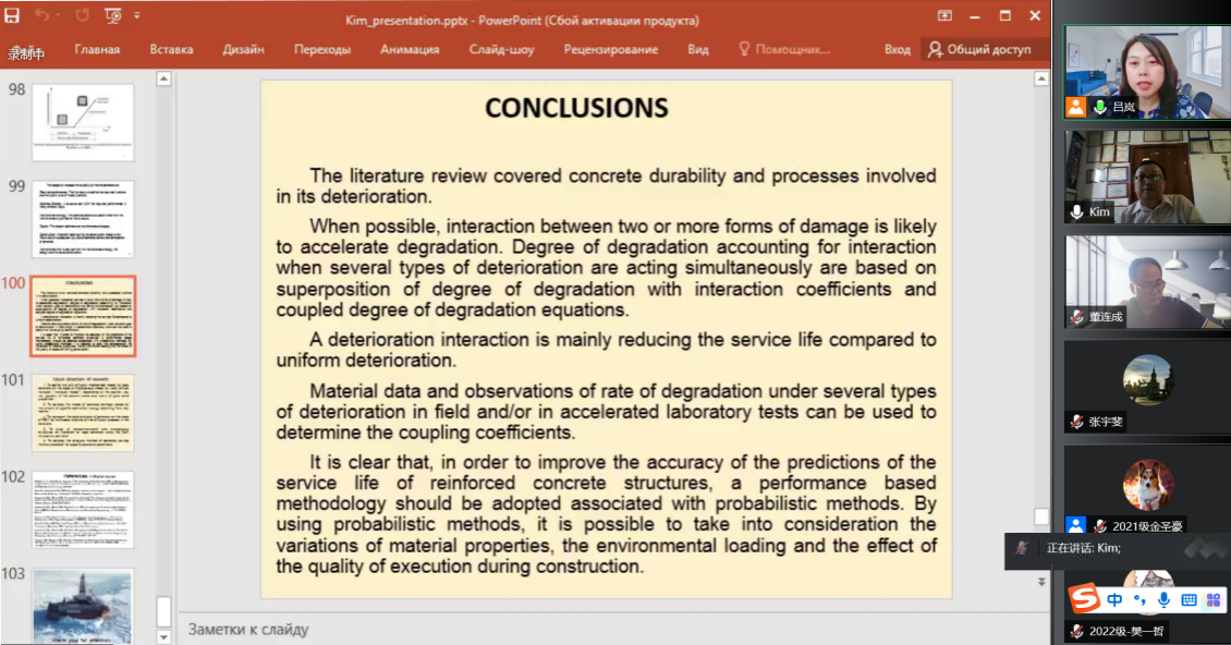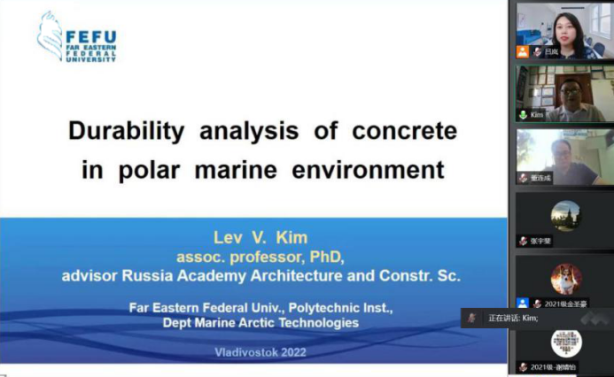 6月27日下午,建筑工程学院邀请了俄罗斯建筑与建筑科学研究院(RAACS)顾问,RAACS混凝土和钢筋混凝土破坏科学委员会委员,俄罗斯工程院顾问,国际生态、人类与自然保护科学研究院通讯委员,国际产学研用合作会议框架下中俄导师联合培养研究生项目俄方导师,俄罗斯远东联邦大学Kim Lev教授通过腾讯会议VOOV国际平台做了题为《极地海洋环境下混凝土耐久性分析》的学术报告,并与我校师生进行了广泛热烈的学术交流。